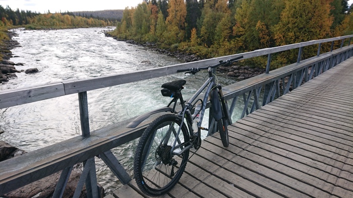Lämnade bilen vid parkeringen slutet av vägen och laddade med lunch. Växlade till min mountainbike och cyklade inledande över bron över Sitoälven. Den smala grusvägen är en mil och tog ca 45 min att cykla. Går att cykla med vanlig cykel.
