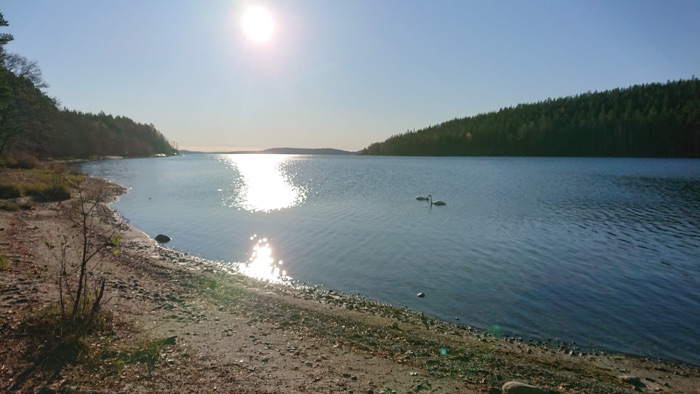Jag klev upp tidigt strax efter 6 när det fortfarande var beckmörkt och lagade frukost. Läste Karin Smirnoff och löste korsord. Kvicksilvret låg på – 1. Hade med mig en kasse och fyllde den med kvarglömt skräp i form av plastflaskor, plastförpackningar och värmeljushållare. När solljuset kom fram startade jag min vandring tillbaka till bilen. Löven frasade under fötterna och det låg frostkristaller på marken. Det var en halvmulen dag med lite sol emellanåt. Kände mig tacksam för denna tid i Skuleskogen och speciellt för tiden vid stugan vid Tärnättvattnen.