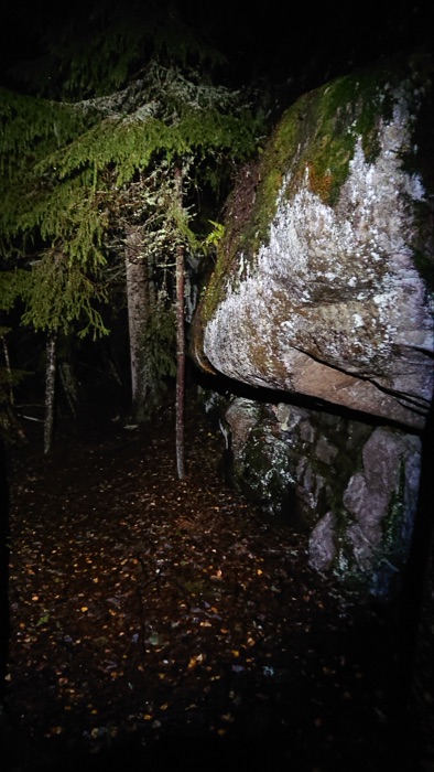 Vandringsleden var ibland bred och slät och ibland med rötter, sten och rinnande vatten. En del partier hade en klippvägg till höger. Björkarna lyste upp i pannlampans sken.