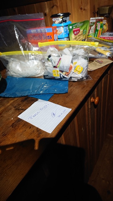 Lagade middag med gas som fanns i stugan. Fanns tre stora gastuber varav två var fulla. På bänken fanns massor med mat. Verkade som om maten kom från Holland. Tre påsar med nudlar såg ut som att råttorna ätit på. Gick till kojs i min sovsäck vid midnatt.