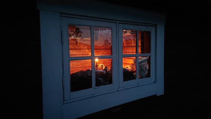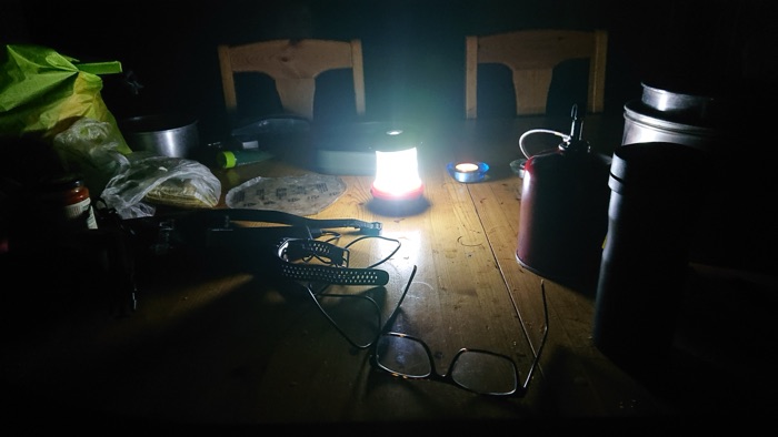 Jag vandrade 3,4 km i pannlampans sken och kom tillslut till övernattningsstugan på Tärnättholmarna vid Tärnättsundet och tittade först in i vedboden som var tom. Vid vedkubben låg lite blöt ved. Gick in och kollade i stugan och där fanns torr ved. Vågade inte chansa att gå vidare in mot Tärnättholmarna för att finna den andra eller tredje stugan full med vandrare eller slut med ved. Jag planerade att sova själv i stugor på denna tur, ville dock inte dela stuga med andra pga corona. Hade med mig tältet om stugorna skulle vara fulla.