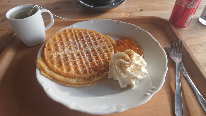Efter Skuleskogen begav jag mig till Skuleberget. Lunch, våfflor och vyn hägrade. Jag körde till Naturrum och valde grottstigen upp. Jag mätte ca 700 m på stigen i upp. Det var vatten och is på en del stenar. Vandringen upp var riktigt fysiskt utmanande. Det visade sig att Toppstugan var öppen 12-15. Så jag gick kalottleden runt på toppen och fick en 360 graders vy från berget.