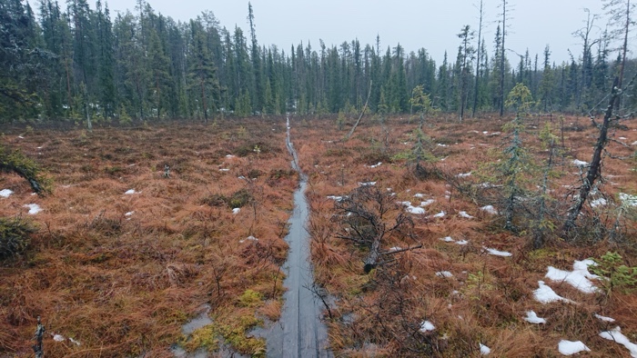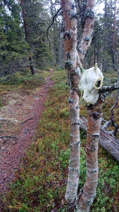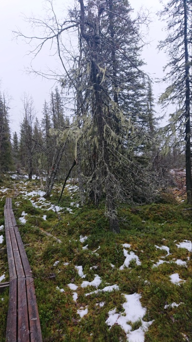Lördagen var mulen och det lätta snöfallet hade gått över till lätt regn. Jag kommer ihåg att 2017 mötte vi Fredrik Tysk strax söder om Muttosluoppal som vandrade i Muddus och sov i Arvidssonstugan utanför leden. Jag var sugen att besöka Arvidssonstugan eller Muddusfallet men insåg att tiden inte skulle räcka till det denna gången så jag lade prestation och många kilometer under kängorna på hyllan.
