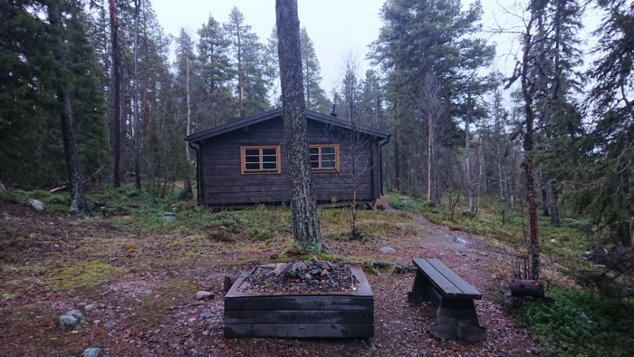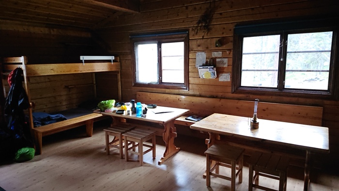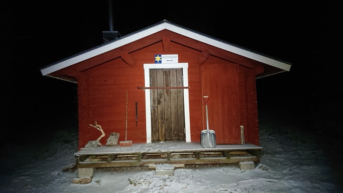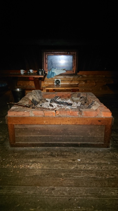 Den stora stugan vid Muttosluoppal var upptagen och jag tänkte först tälta på udden men valde den kåtaliknande stugan som jag inte tidigare övernattat i. Tände en stor brasa och blev rejält rökt så tårarna rann. Fick vädra ut rök som stod som en plym upp mot skyn genom dörren. Såg stjärnorna tindra klart en stund på himlen när molnen passerade och lämnade ett hål. Lagade middag på en av mina färdiga påsar med mexicanasoppa, snabbmakaroner och ölkorv.