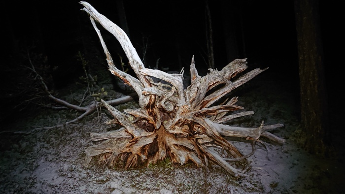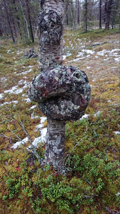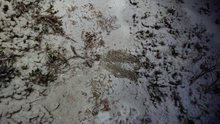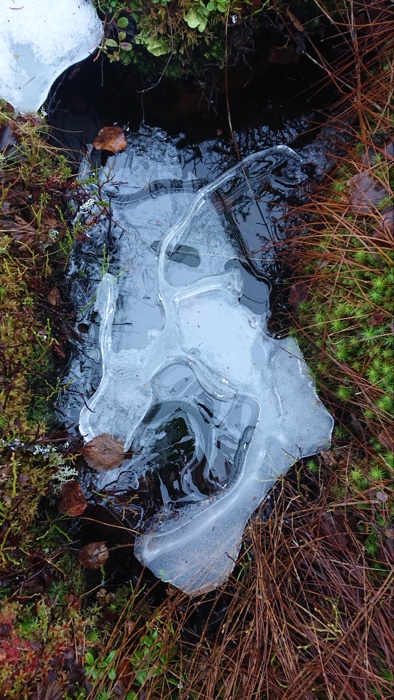 Jag märkte att myren fortfarande var frusen och gick att gå på. Passerade flera riktigt stora myrstackar. Såg ett grovt träd som blåst av som en tändsticka.