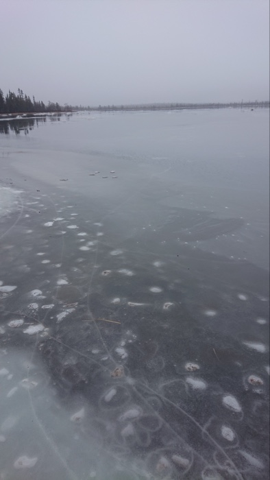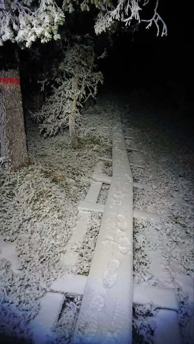 Leden var mer eller mindre pudertäckt av snö. Vissa partier hade mer snö och is. Träden var också pudertäckta. Möttes av ett par färska fotspår i snön av en större och mindre tvåbening på väg till parkeringen. Emellanåt doftade det gott från skogen.