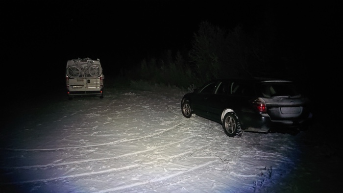 På parkeringen stod en tyskregistrerad camper men ingen var där. Min nya bil klarade vinterväglaget bra. Som ett strykjärn efter vägen. Lite mjuk i fjädringen på sista biten på den knöliga skogsbilvägen.