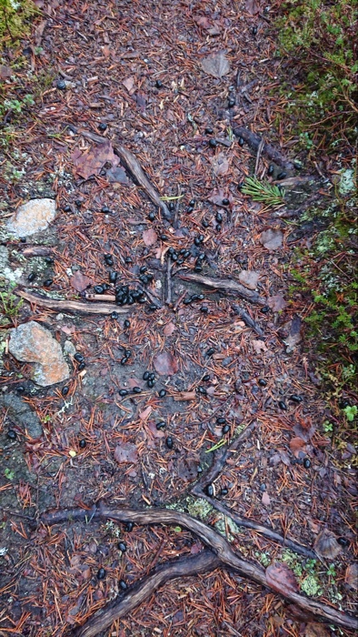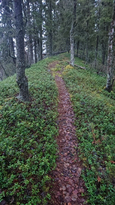 Steg upp tidigt för att gå tillbaka till parkeringen. Leden går till att börja med mellan rullstensåsen och myrarna. Såg minst 9 ripor i vinterskrud flyga upp från marken under min vandring.