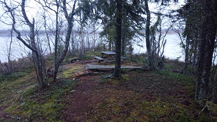 Längst ut på rullstensåsen ligger bästa tältplatsen. Finns även bord med bänkar. Isen var så tjock att det gick att gå på den.