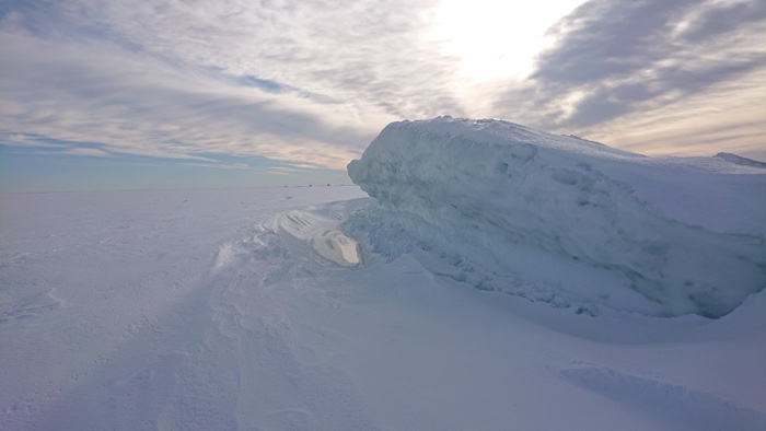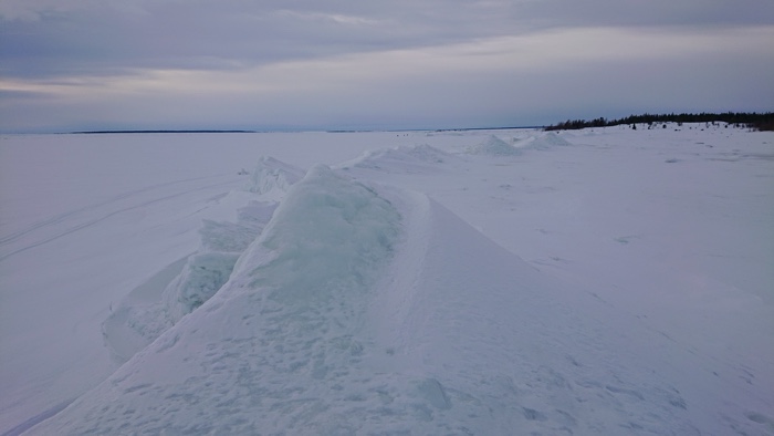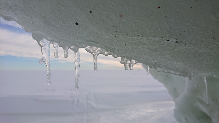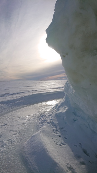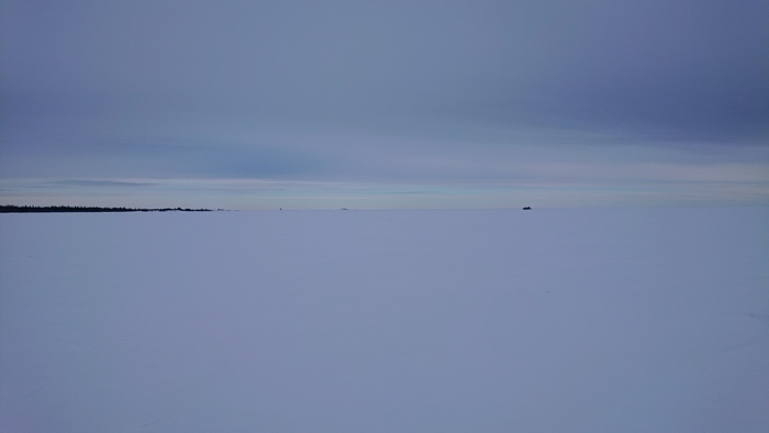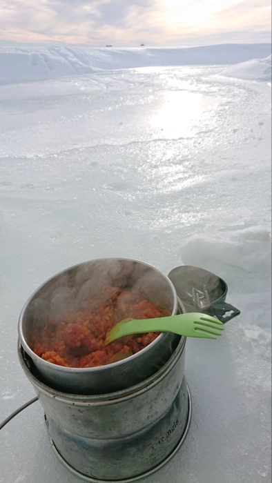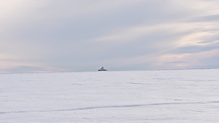 Värmde lunchen på mitt trangiakök i isgrottan och såg på de svarta prickarna som visade sig vara fartyg i fjärran. De färdades i isrännan till och från hamnen i Luleå vid SSAB. En kär vän ringde och förgyllde lunchen.