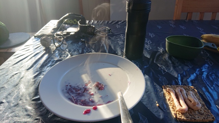 Åt en stadig frukost i form av havregrynsgröt med blåbärssoppepulver, 2 kokta ägg och fröknäcke med tubost.