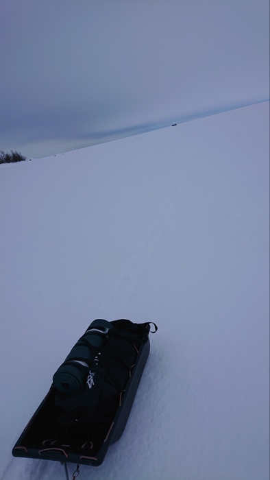 En svävare rundade mig på håll och yttersidan av Småskär. Det fanns inga skoterspår på denna sträcka men skaren höll bra. Pulkan gled på bra.