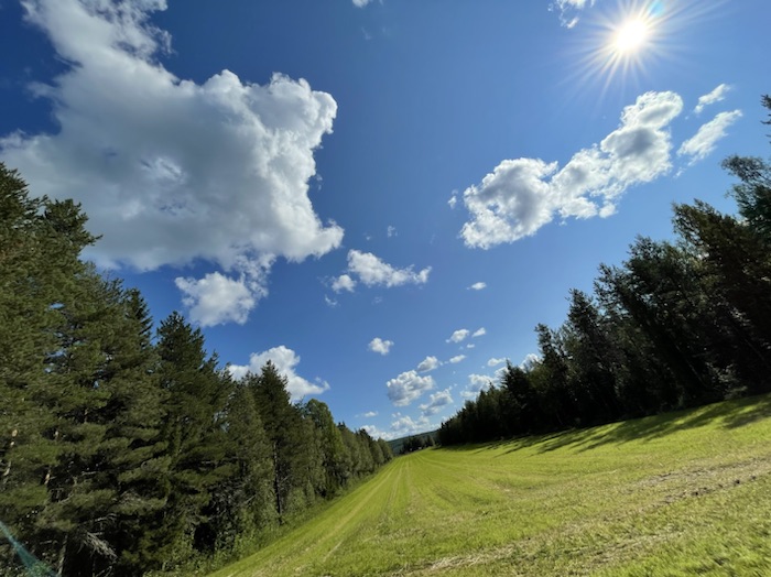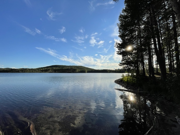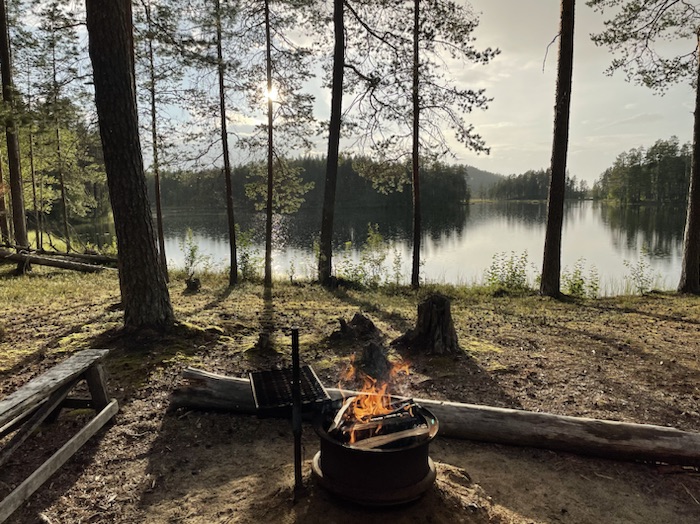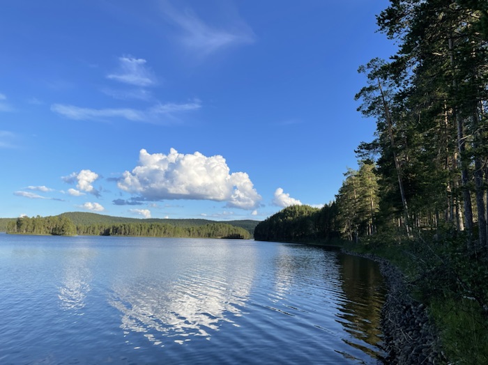 Jag lagade grötfrukost och lyssnade till Max Frost låt Good Morning. Trollsländor hovrade över stranden. Njöt av en klarblå himmel och solens strålar som silade mellan de ståtliga tallarna. Stocken rök fortfarande i eldstaden.