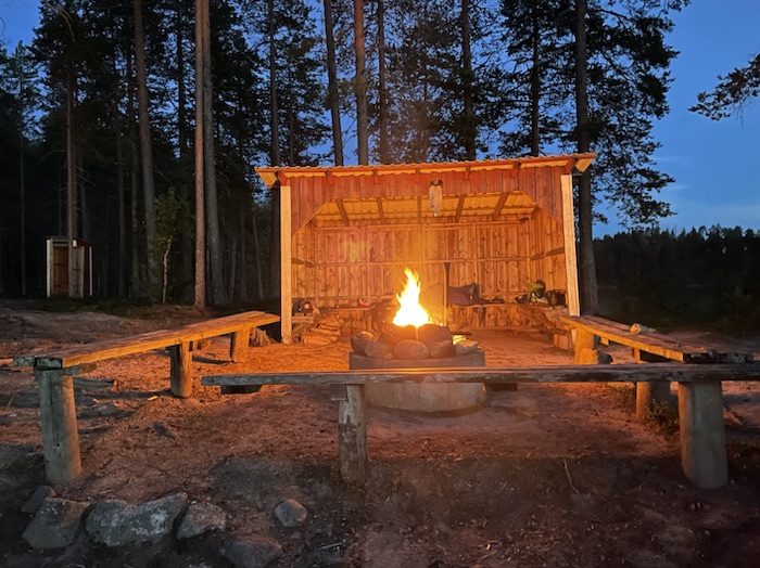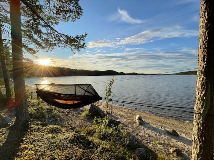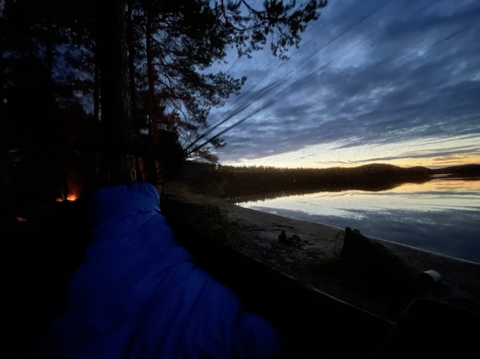 Storlommen ljöd med sitt klagande läte en bit bort på Östersjön. Fiskar plaskade i det stilla vattnet. Myggen surrade ovanför min skyddande kokong. Elden sprakade nedanför mig. Njöt av hängmattehänget.