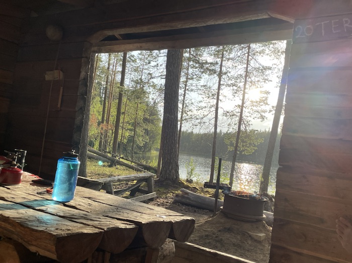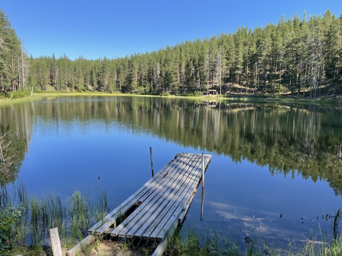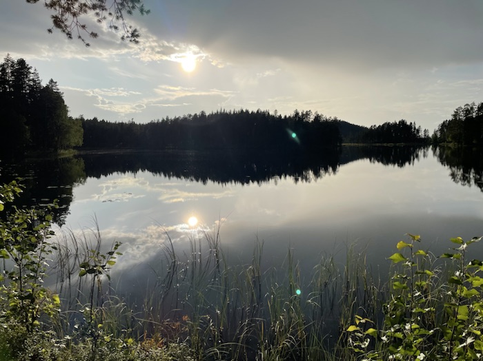 Vaknade upp till hacke hackspetts knackande på ett träd och klev upp till en spegelblank Östersjön. Det uppblåsbara liggunderlaget låg vid ena sidan och de rullbara liggunderlagen låg på andra sidan av hängmattan. Fiskar vakade på det stilla vattnet. Lommens sorgsna läte ljöd högt och simmade målmedvetet över sjön.