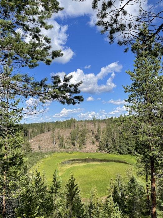 Cyklade mot Missutjärn och vid vindskyddet där träffade jag tre vandrare som också sovit i hängmatta. En hade skadat sig i knät och de skulle avbryta. De hade dock nära från Umeå för att göra om turen. Passerade stugan jag rastade i förra gången jag cyklade här. Denna gången var vädret mycket vackrare. Ledde upp cykeln på den höga rullstensåsen.