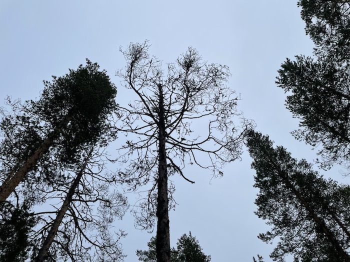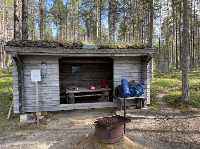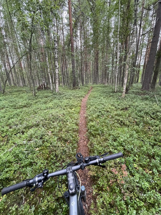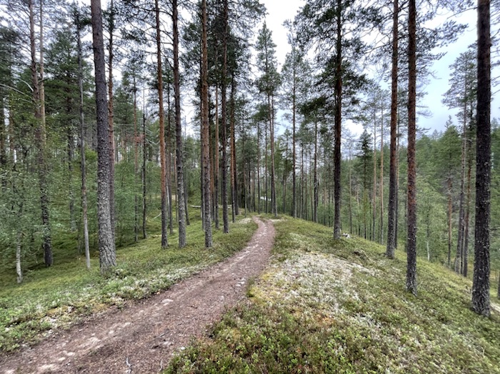 Vaknade tidigt till kråkans kraxande och något som krafsade på vindskyddet. Krafsandet visade sig vara en ekorre som pilade upp i det intill liggande trädet. Hackspetten bearbetade högljutt en trädstam. Gjorde tidigt morgonbestyren för att snabbt komma iväg på leden med cykeln. Södra delen rekommenderas för MTB och norra delen för vandring. Jag ville cykla runt Aborrträsk.