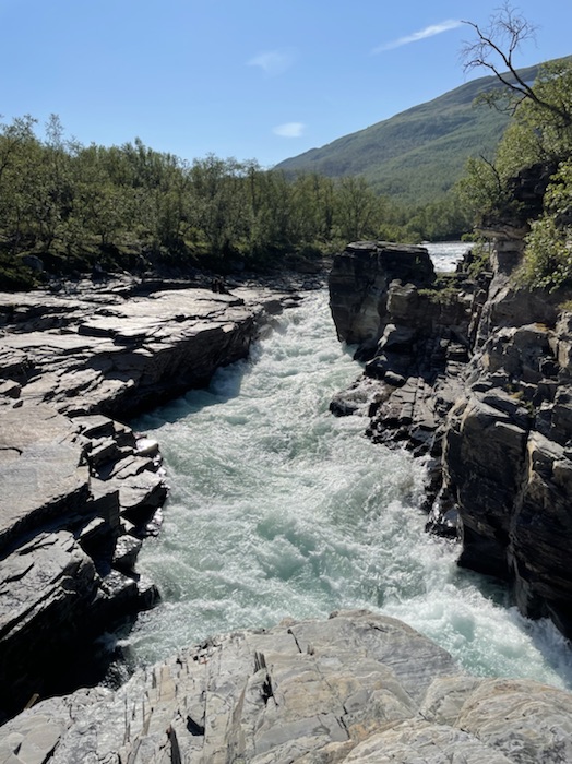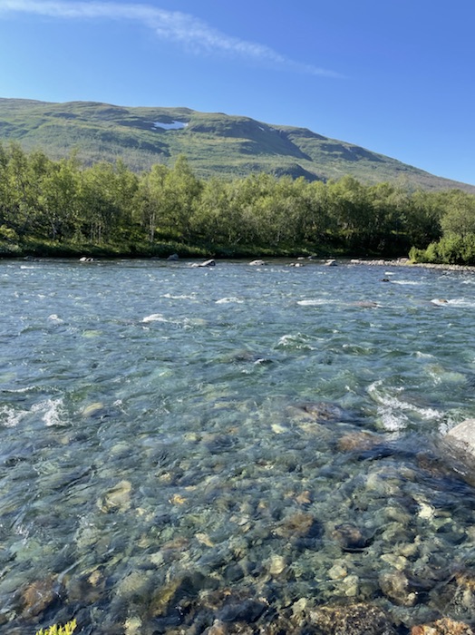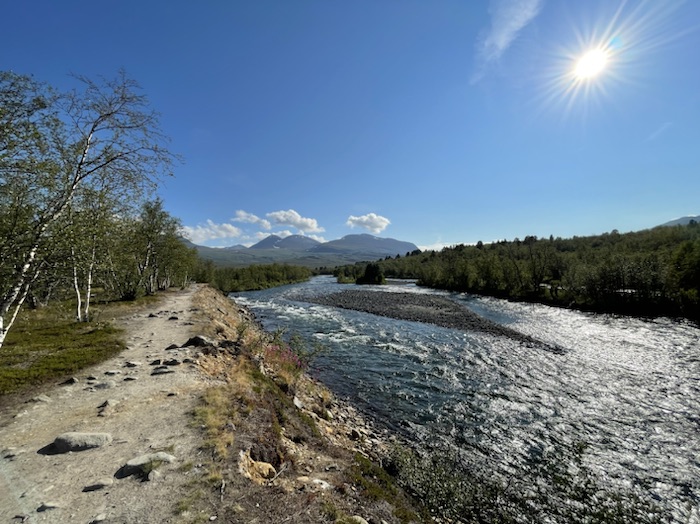 ”Abiskojåkkå brusade och skummade med sitt klara vatten. Känslan av lycka infann sig snabbt. Den där sköna känslan när jag far ut på äventyr. Ryggsäcken kändes inte tung, solen strålade mellan fjällbjörkarna och det var varmt skönt.”
