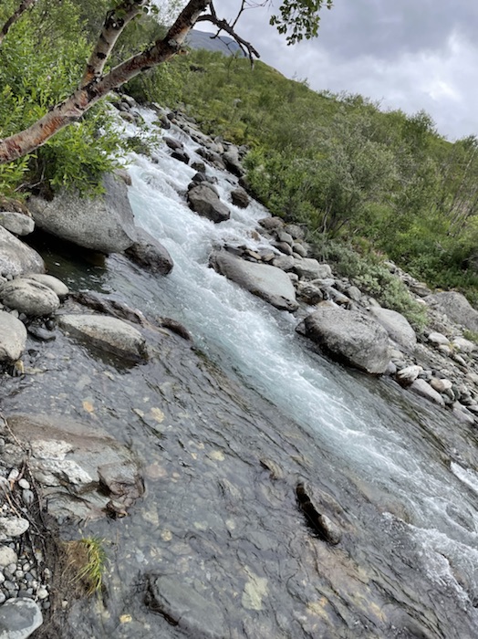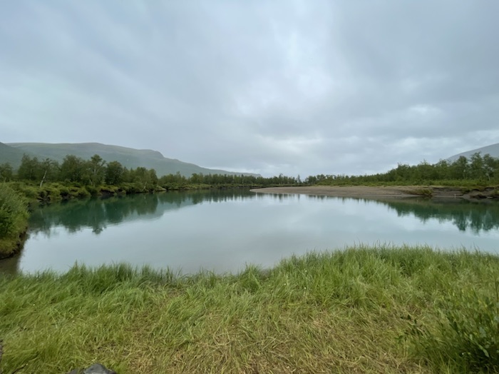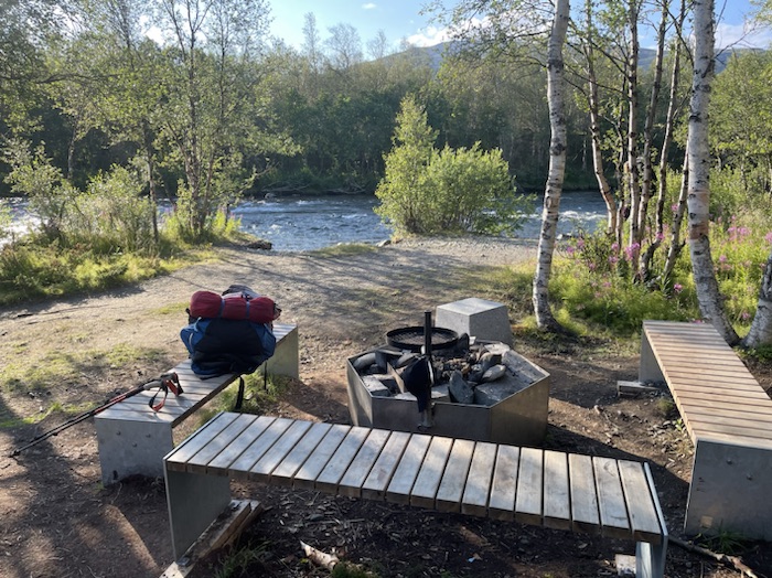 Mötte en äldre man i 65-70 årsåldern med ryggsäck och packraft. Han skulle lägga i sin packraft i jokken i höjd med Lisas Stuga. Lisas stuga ligger på andra sidan jokken utanför ledsystemet och svår att nå. Han tipsade om nedanstående lunchplats på bilden nedan och att den var bra för fiske. Jag var dock för trött för att fiska och hade en tid att passa.