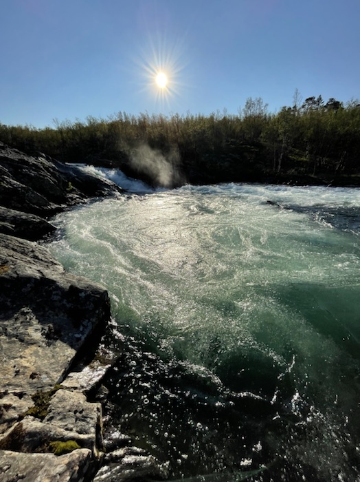 ”Jag packade ihop mina pinaler och fortsatte min vandring. Såg ett vackert vattenfall med vattendropparna i luften i motljus. Fanns flera vattenfall som i trappsteg. Forsarna brusade i olika tonarter.”