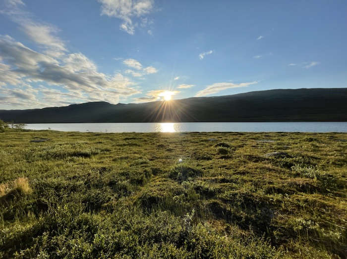 ”Vi fortsatte vår vandring då vi skulle tälta söder om Abisko Nationalpark. Vi slog följe med en tysk ingenjör inom förpackningsindustrin som hade sin sista chans att kunna vandra Kungsleden på 28 dagar då han sen inte skulle kunna ta så mycket semester på sommaren. Giron lystes upp vackert av den dalande solen. Vi passerade nationalparksgränsen och såg att det fanns dass vid bron över Siellajohka. Det var många tältare så svårt att hitta en tältplats. Tillslut hittade vi en tältplats där vi kunde sätta upp våra boningar. Mikael med sitt lättviktstält med staven som tältpinne och tysken med en fjällrävenkopia som hette Nordisk tillverkad i Kina. Han sa att dom beställer grejer till sina maskiner till förpackningsindustrin från Kina. Förut kunde leveransen ta 24 timmar och idag kan det ta sex veckor.”