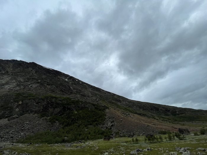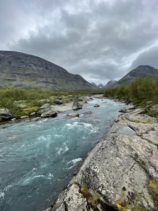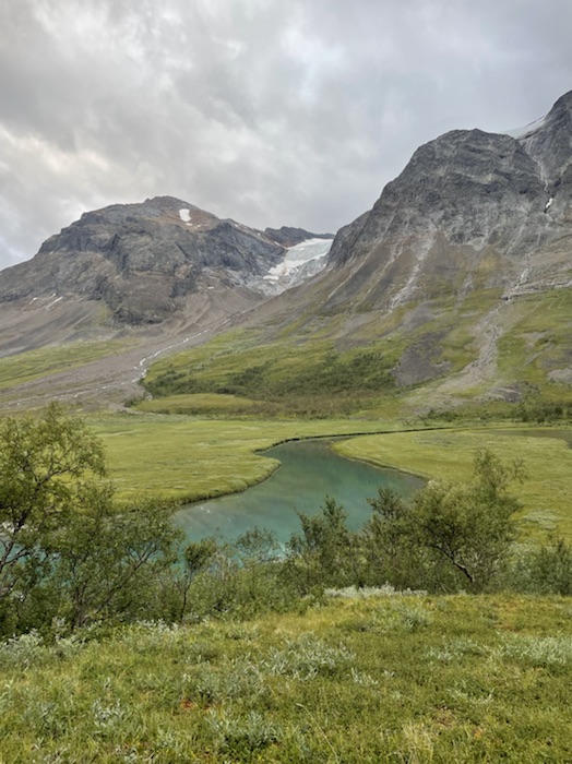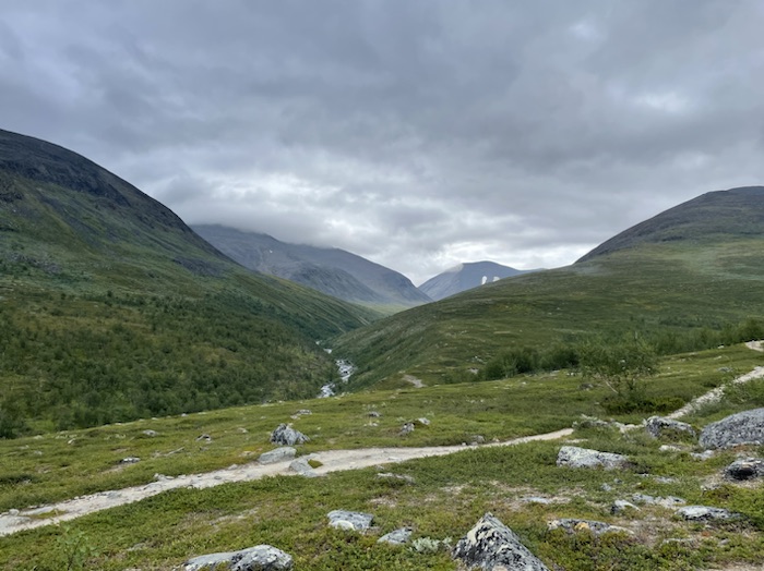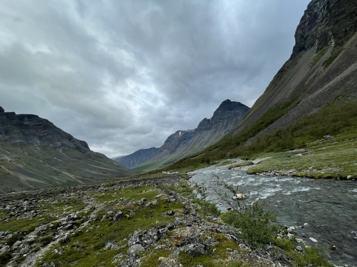 Jag passerade den högsta punkten och skådade ner i Vistasvaggi med branta fjäll som tornade upp sig på ömse sidor om dalen. Grönt nere i dalen och Visttasjohka som slingrade sig fram där nere. Fjällbranterna var grönklädda långt upp. Norra fjällbranten glittrade i grönt. Grå rasmassor högre upp och grå fjälltoppar med snö på de södra topparna. Vissa delar var rostfärgade. Jag tappade andan när jag insöp detta överjordiskt vackra landskap.