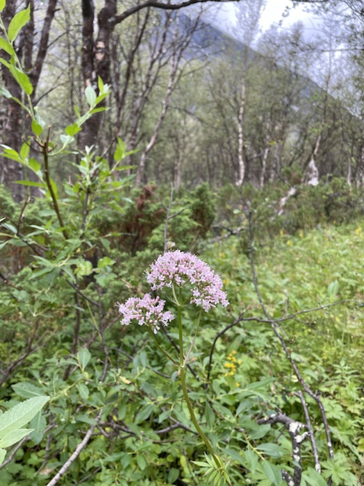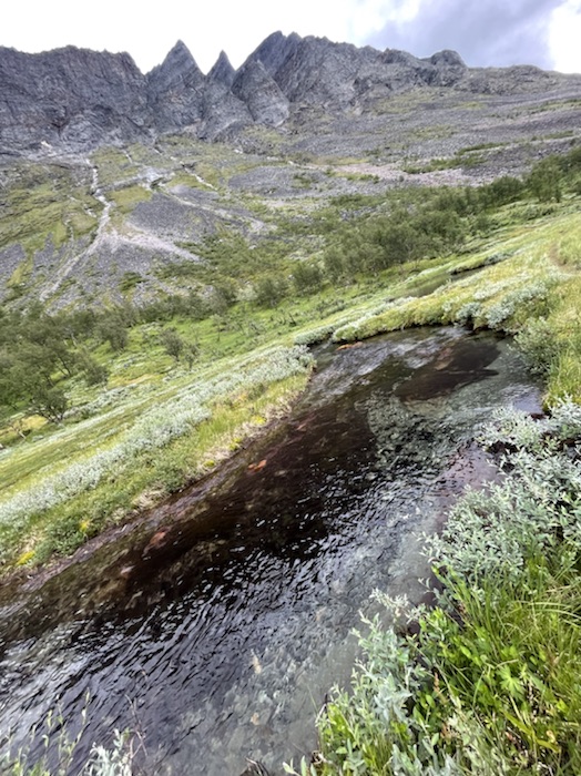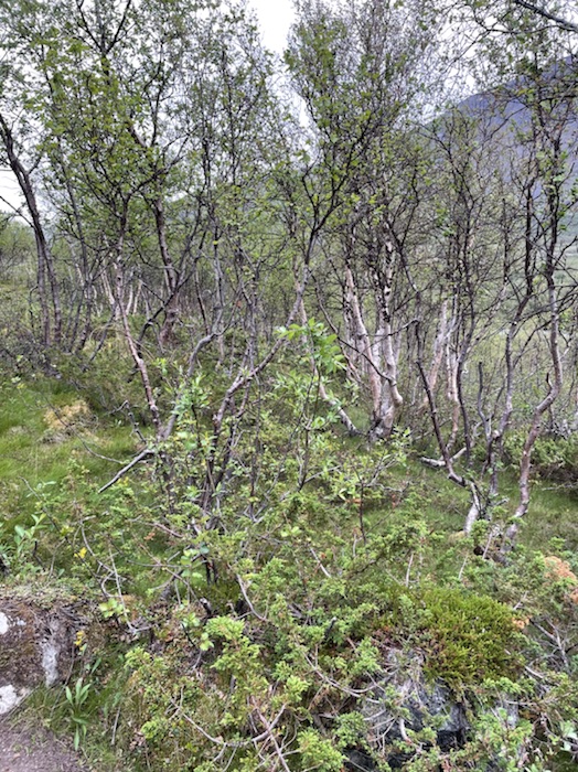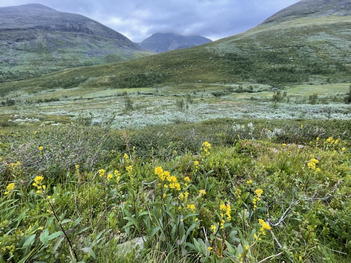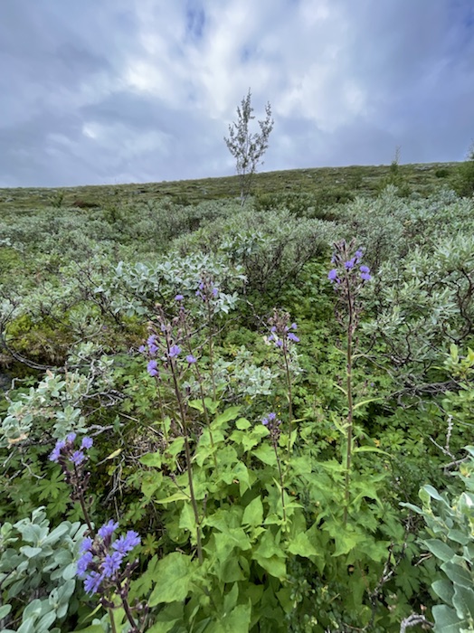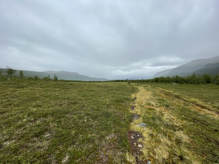 Vaknade upp mycket piggare även om det var en kort sömn och lagade min grötfrukost sittandes inne i tältet. Gjorde sen morgonbestyren. Ett lätt regn smattrade mot tältduken som avtog. Gick sen och tvagade mig i bäcken bredvid, diskade och fyllde på vattenflaskorna. Började min vandring strax före 08:00. Vandrade i ett vackert landskap med mycket fjällbjörk, enar och många blommor. Fåglar sjöng för mig. Bestämde mig för att prova spela in dagboksanteckningar istället för att skriva.