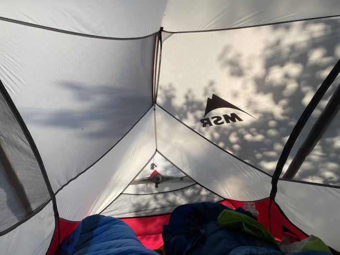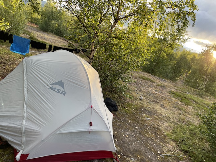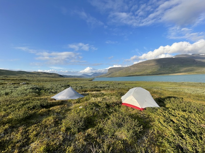 ”Somnade snabbt och vaknade till larmet 6:00. Glömt stänga av vardagsuppstigningen. Somnade sen en stund till. Tysken var den som var klar först och sa hej då. Sen gick jag och Mikael snarkade gott i sitt silvriga tält. Jag packade ihop och precis när jag gick klev han ut och sa att vi ses vid nästa stuga.”