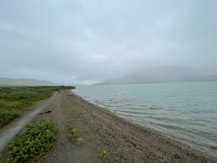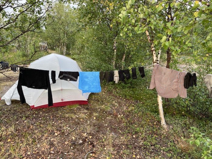”Vaknade till regnets smatter mot tältet. Drog mig ett tag till och vaknade 8 tiden för att laga frukost. Mikael gick tidigare och jag myste i tältet. Lyssnade på ett kort radioprogram om vandring. Att det finns en diagnos för att tappa bort sig att vandrande inte alltid setts med blida ögon. Som när Reese Whiterspoon vandrar med sina dyra vandringsskor och en journalist undrar hur det är att vara hemlös. Hon säger att hon vandrar och är inte hemlös.”