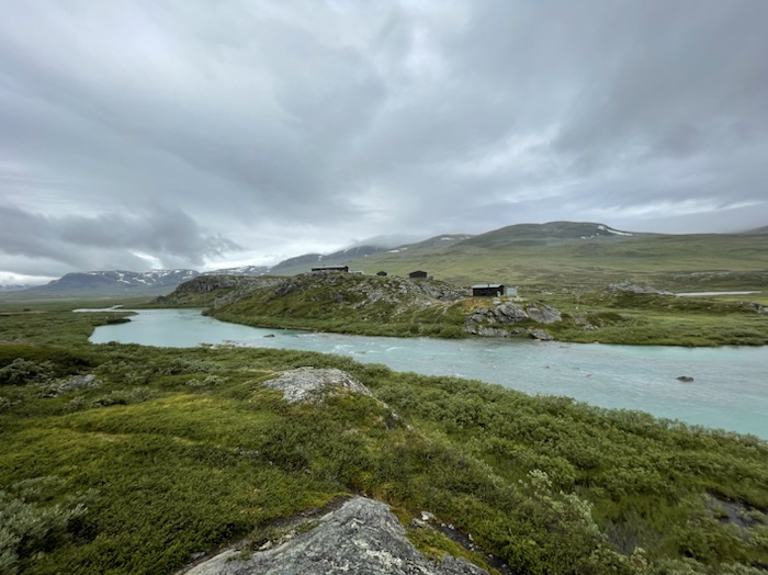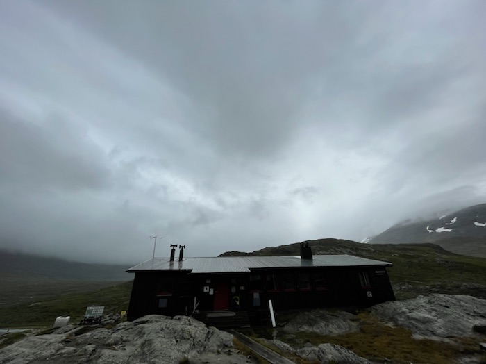 ”Närmare 12 packade jag ihop mina pinaler och gick till STF Alesjaure 12:00. Gick till receptionen butiken för att köpa lunch då jag förstört en lunch. Glutenfritt och laktosfritt hårdbröd, renost och lufttorkad skinka och the blev det. När jag läser i boken där man meddelar sin färdväg är det flest svenskar som skriver men tyskar ligger på god andra plats, Holland, sen finns länder Skottland, Indien, Belgien, Danmark, Indonesien, Schweiz mm.”