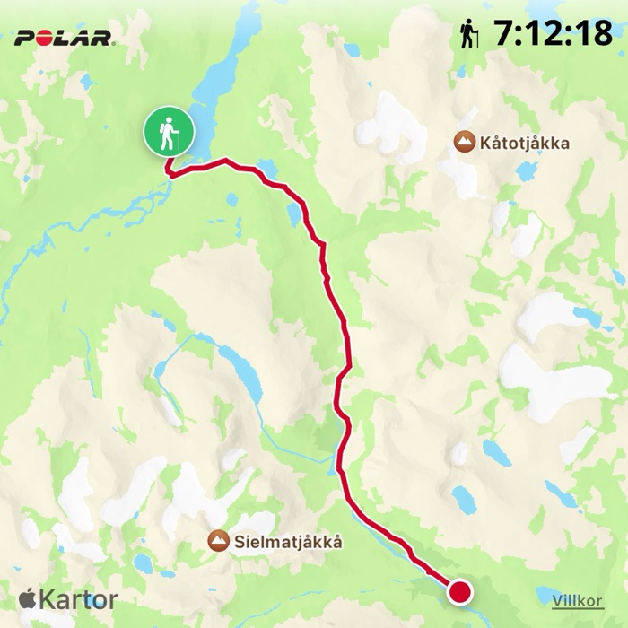 ”Träffade en kille som gått Kungsleden från Ammarnäs på 20 dagar. Han hade gått minst 18 km per dag och som mest 42 km per dag. Vindpusten från honom kunde intyga detta.”