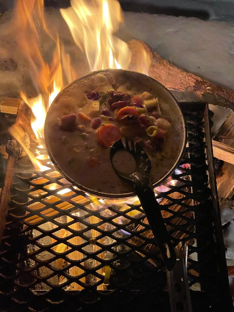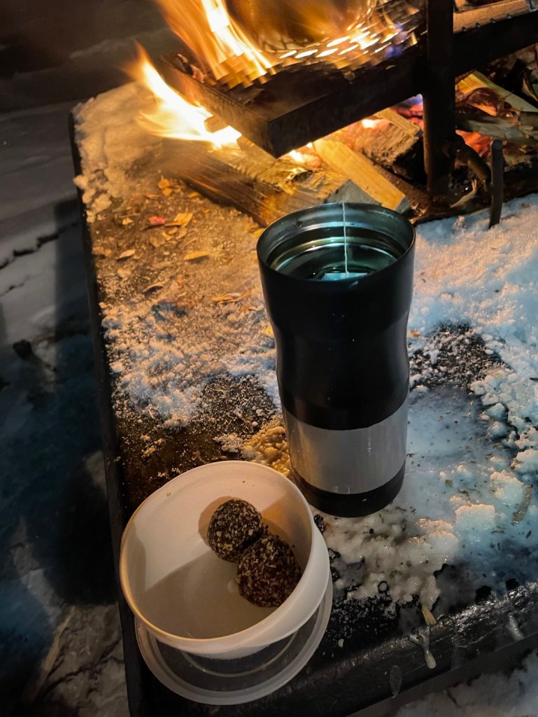 Det var en kylslagen kväll även om inte -8 grader är så kallt. Jag borde ha haft tunna fingervantar vid matlagningen och varmare skor. Tappar känseln i fingrarna när jag fryser så.