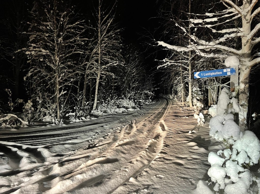 Ta sen nästa vänster vid skylten Lustigkullen. Denna väg plogas inte och tar dig till vändplanen till stigen som börjar mot Lustigkullen. Alternativt kan du köra längre fram på landsvägen till parkeringen på vänster sida innan Lassbybron och ta skidor eller gå på skoterleden Malmens Väg när den anläggs. Finns dass på höger sida om vägen.