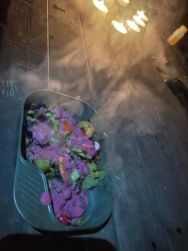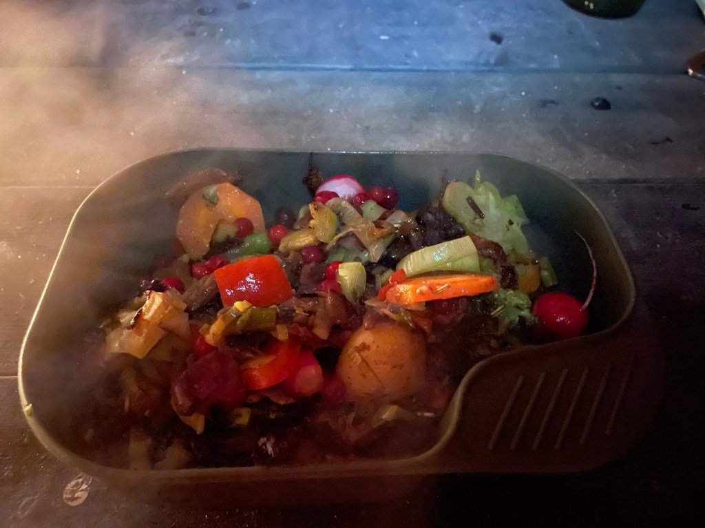 Tog en portion och hällde över lingoncremen. Det var mycket gott och smakade bra ute. De syrliga lingonen i kontrast mot de kryddiga grönsakerna var utsökt.