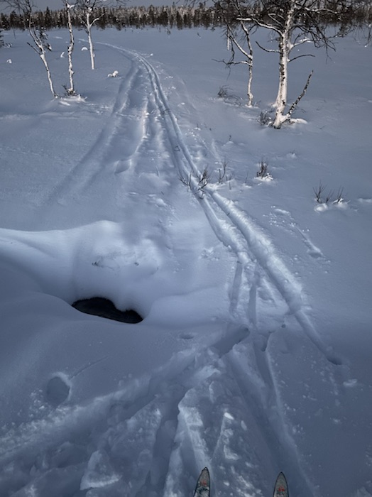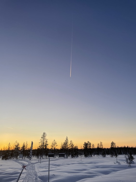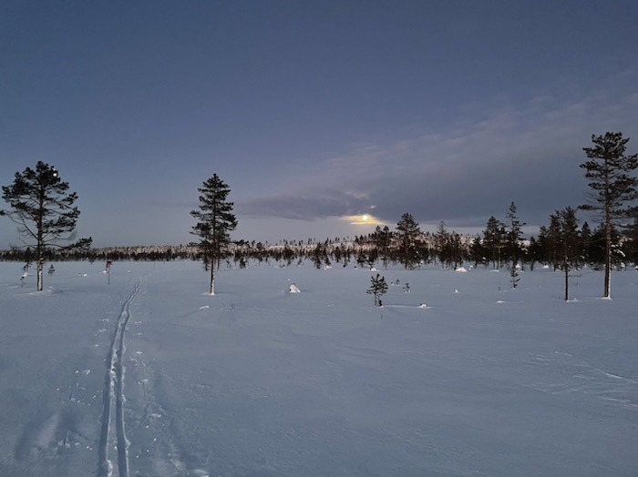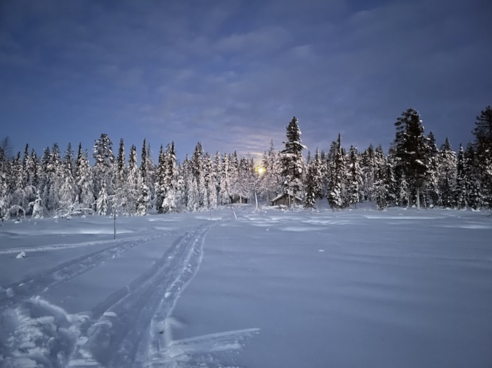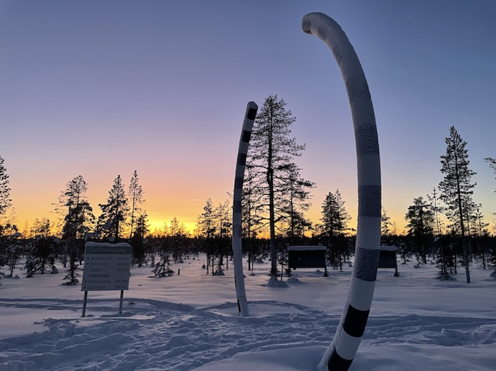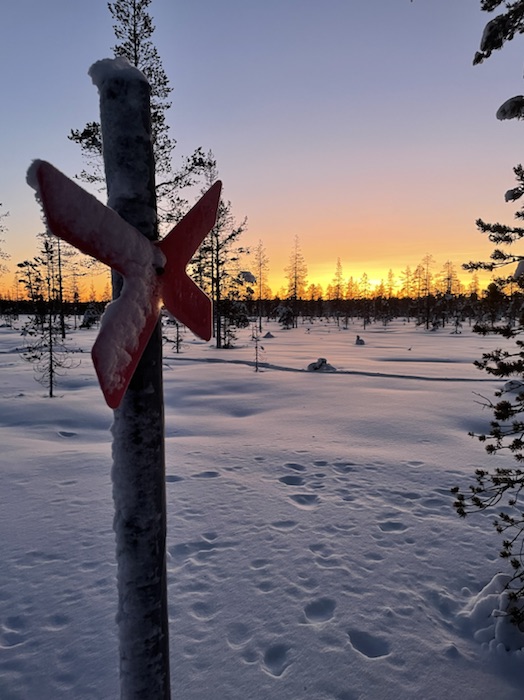 Tog mig sen en skidtur efter maten via polcirkelportalen som den världsberömde konstnären Erling Johansson skapat. Han är född i Sarvisvaara inte så långt från polcirkeln. Polcirkelportalen markerar den norra polcirkeln eller arktiska cirkeln och är den yttersta plats, räknat från Nordpolen, där solen inte går ner vid sommarsolståndet samt inte går upp vid vintersolståndet.