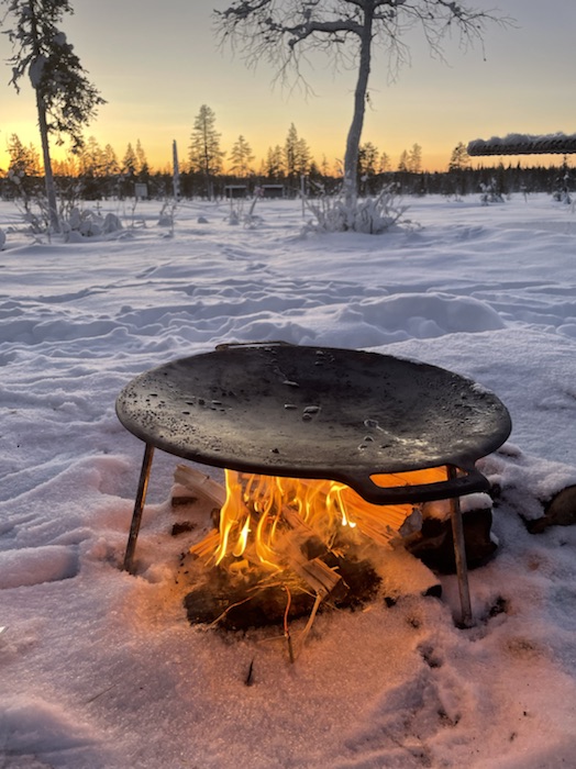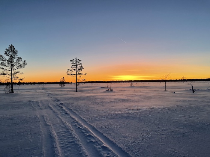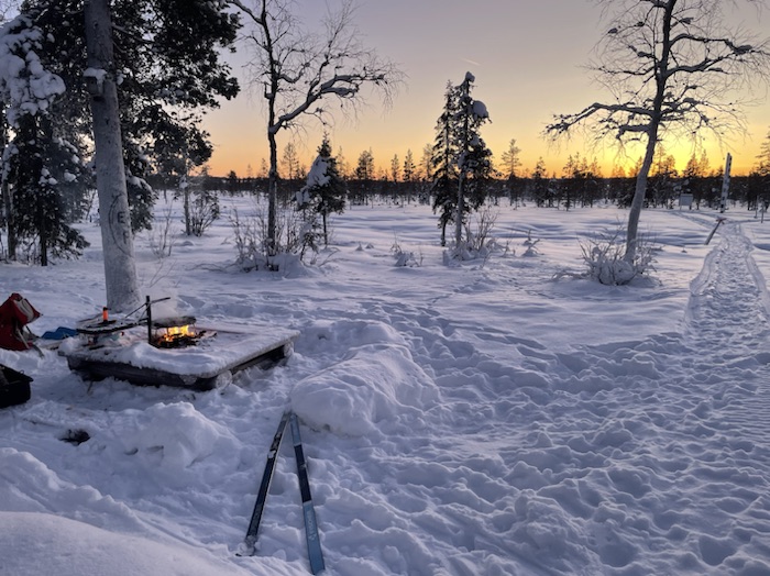 Denna dag var det en sån där dag med rosa horisont som jag tycker så mycket om. En passande dag att laga mat ute vid polcirkelportalen och åka skidor på Malmens väg. Inte ett så nära äventyr men en av mina favoriter. Körde de 73 km norrut från min stuga och njöt av de vackra färgerna från himlavalvet under bilresan. När jag var framme hade de rosa färgerna tonat ut till fördel för solnedgångens brandgula nyanser mot den himmelsblåa horisonten.