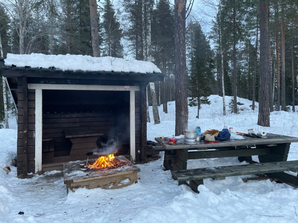 Finns en parkering vid rastplatsen med ett vindskydd med två bord och grillplats och en till grillplats med bänkar. Det var nära att gå från parkeringen till grillplatsen. Hade pulkan att dra ved och muurikka med. Resten i ryggsäck. Veden tar du med dig själv till grillplatsen.