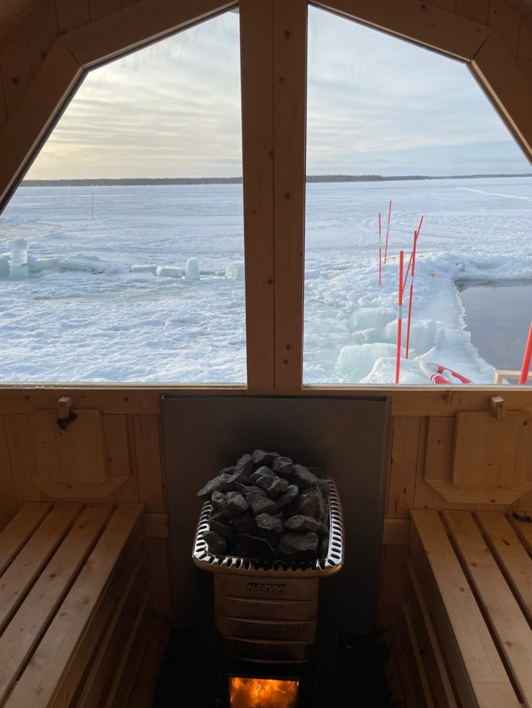 Jag hade varit medlem ett tag i Kallis Luleå eftersom jag gillar kalla bad och att föreningen driver frågan om kallbadhus i Luleå. Denna lördag bestämde jag mig för att boka bastun 16:00-18:00 vid isvaken vid Gultzauudden. Det var fullbokat både före och efter min tid. Jag parkerade vid parkeringen till marinan nedanför Hälsans Hus. Som medlem kan en boka två icke-medlemmar också. Två till killar hade bokat plats i bastun och vi hade intressanta diskussioner om upplevelsen av de kalla baden, om hur det kändes, andningen och effekten på kroppen. Tog mig ett första dopp utan bastu före. Det var riktigt kallt och jag tappade andan ljudligt. Efter fyra dopp fick jag kontroll på andningen. Det var skönt med kombinationen kalla bad och bastu.