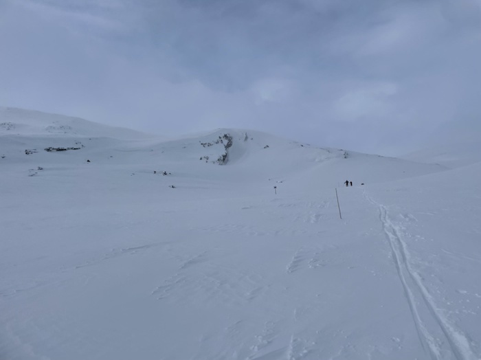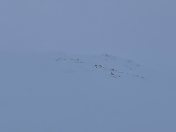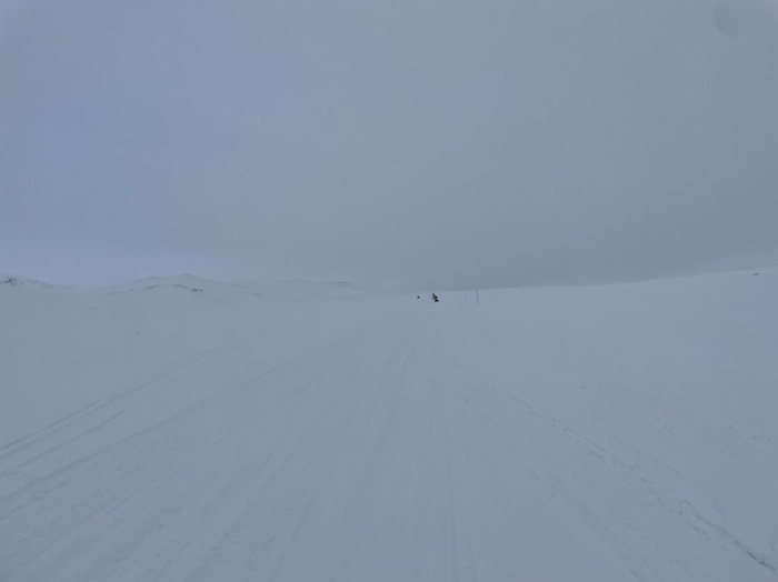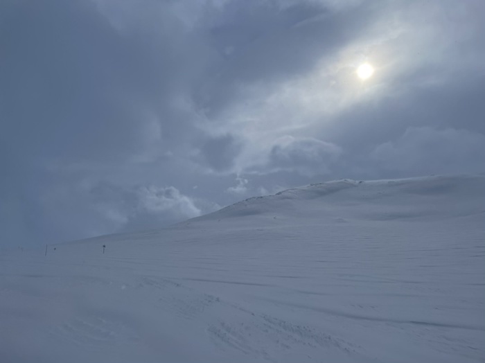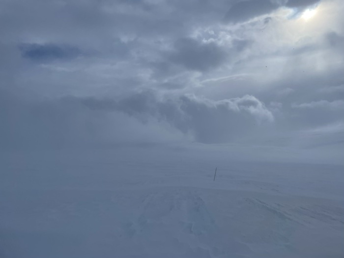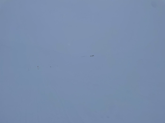 Vinden hade ökat till upp till 18 m/s i byarna och det snöade lite. Sikten var inte så god. Vid en sträcka halvvägs var det svårt att se nästa pinne efter leden.
