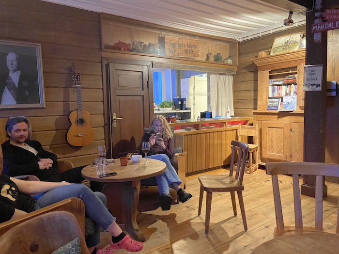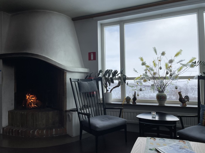 Satte mig sen vid den öppna spisen i huvudbyggnaden. Läste boken Nomadland, skrev och drack te. Personalen matade den öppna spisen med vedträn med jämna mellanrum. Vacker påskprydd vy mot Torneträsk. Njöt av att sitta på denna plats igen.
