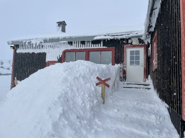 Den oroliga värdinnan välkomnade mig vid dörren. Hon hade ringt mig flera gånger då hon inte visste när jag startade. Jag hade inte läst mig till att det fanns dusch och bastu. Det var en positiv överraskning och var sanslöst skönt med den varma bastun innan middagen. Värdinnan med kollegan serverade älg med kantarellsås och potatisgratäng. Till efterrätt blåbärspaj med glass. Bordsgrannarna var ett trevligt pratsamt par från Sundsvall och Östersund som dagen före kämpat i stormen på turskidor från Låktatjåkka station och fick vända tillbaka. Det var tal om 30 m/s i byarna. Personalen hade fått skotta fram fönstren och dörren som det trängt in snö genom. Det rörde sig om 1,5 meter snö. En ung kvinna som annars jobbade nätter på Björkliden visade en bild på ytterdörren med renskinn på för att bromsa snön som trängde in i entrén.