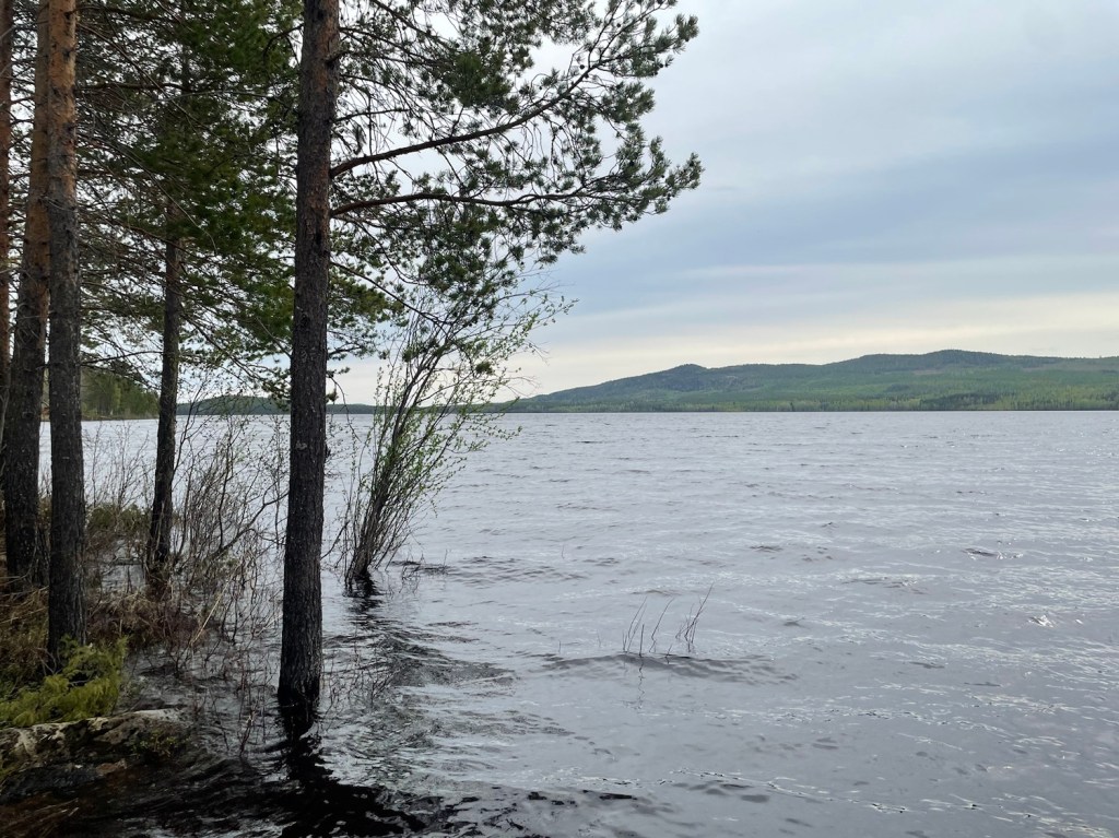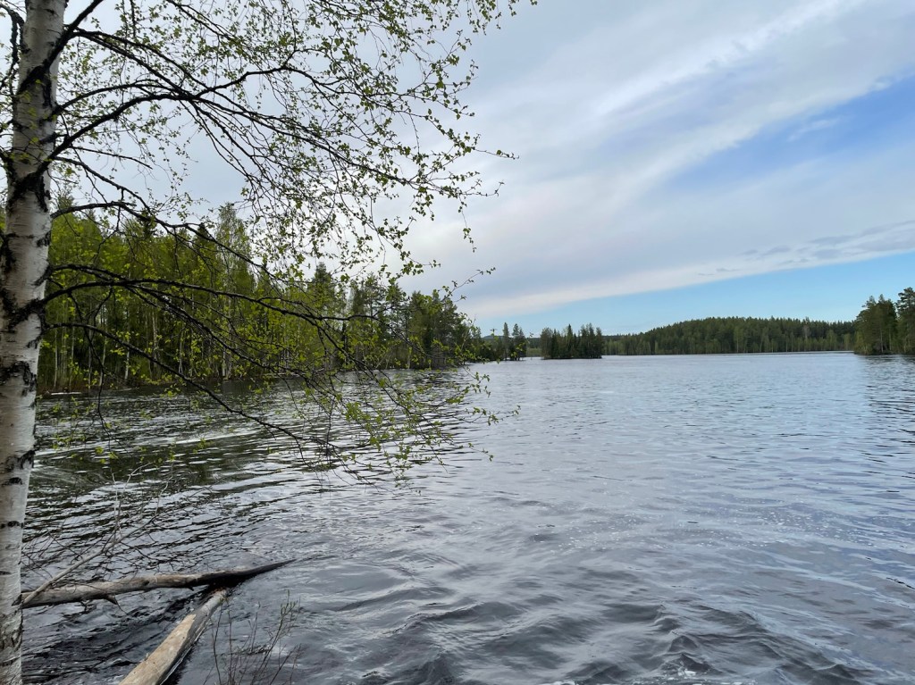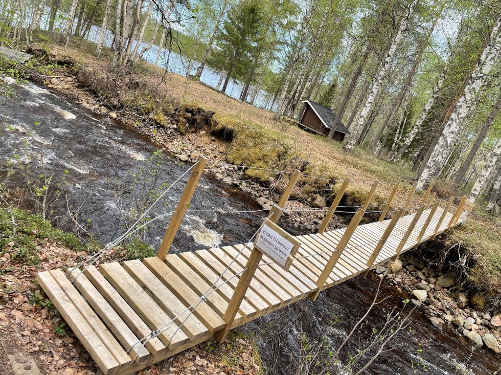 Vid rastplatsen vid Korpforsen där jag tidigare lagat en lunch vek jag av österut nedströms. Kom till en liten gångbro och bar över cykeln. På den lilla holmen som blivit av älvdeltat fanns ett litet vindskydd med en grillplats. Den gräsbeklädda ytan framför vindskyddet hade passat för en tältnatt. Denna plats var helt ny för mig och riktigt fin. Ännu en ny naturskön plats att återvända till.
