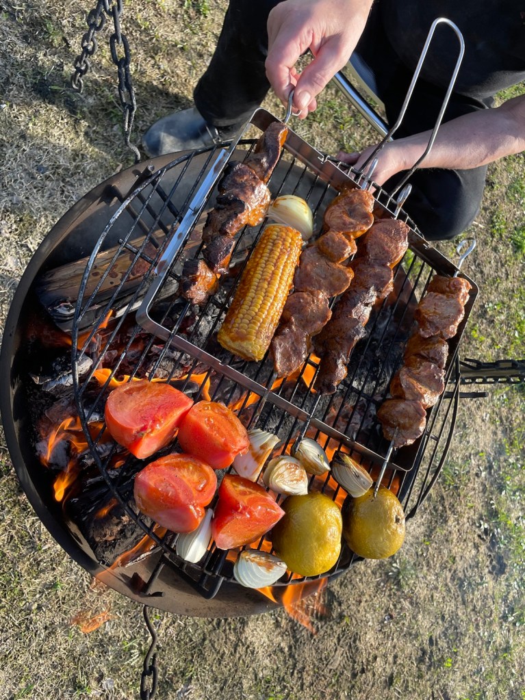 Min far började grilla middagen på bålpannan. Det vankades grillad fläskfilé och grönsaker med den nya grillspetthållaren som jag fått av min far.
