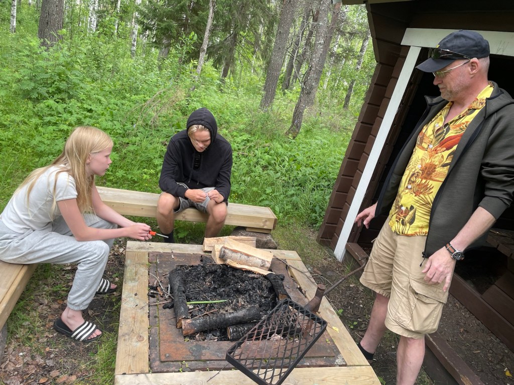 Vi hade med oss ved. Cecilia och Kalmer fick uppdraget att tända elden med tändstål och tampong. Cecilia lyckades skapa den tändande gnistan med tändstålet.