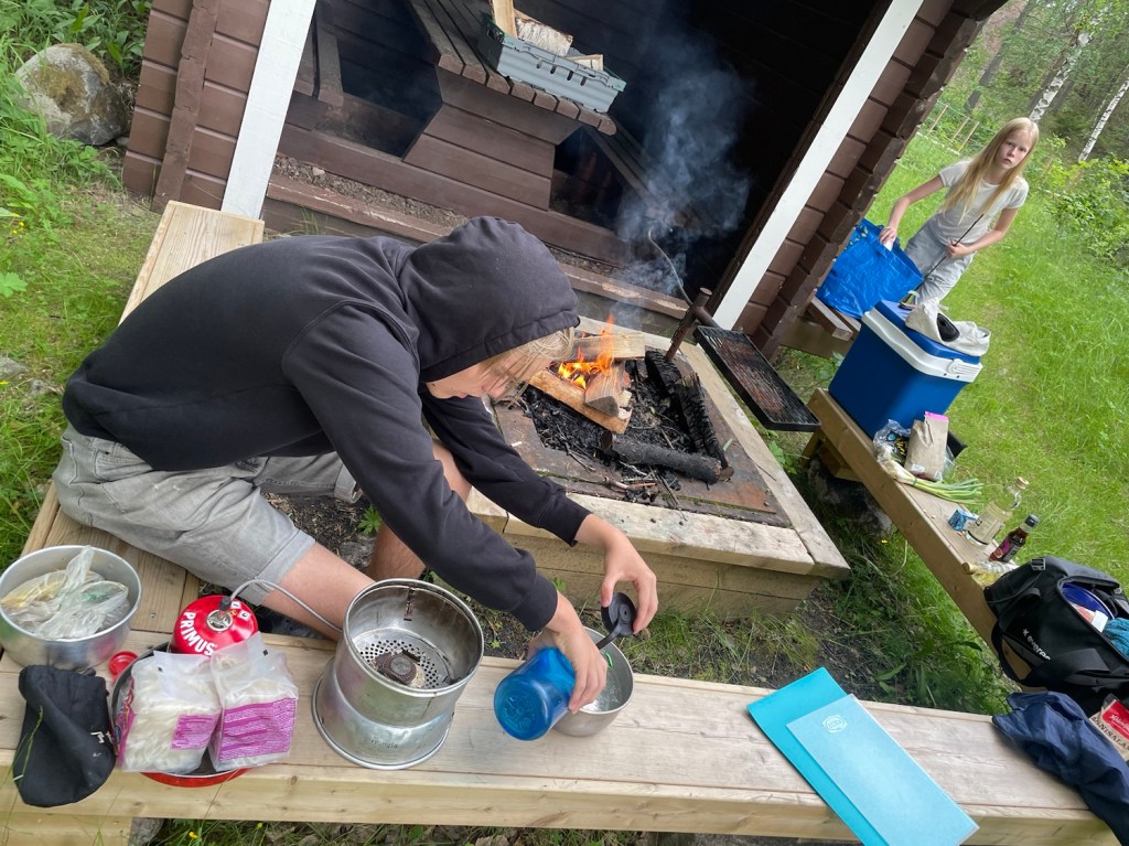Kalmer fick montera ihop Trangiaköket med gastillsats och koka nudlarna.