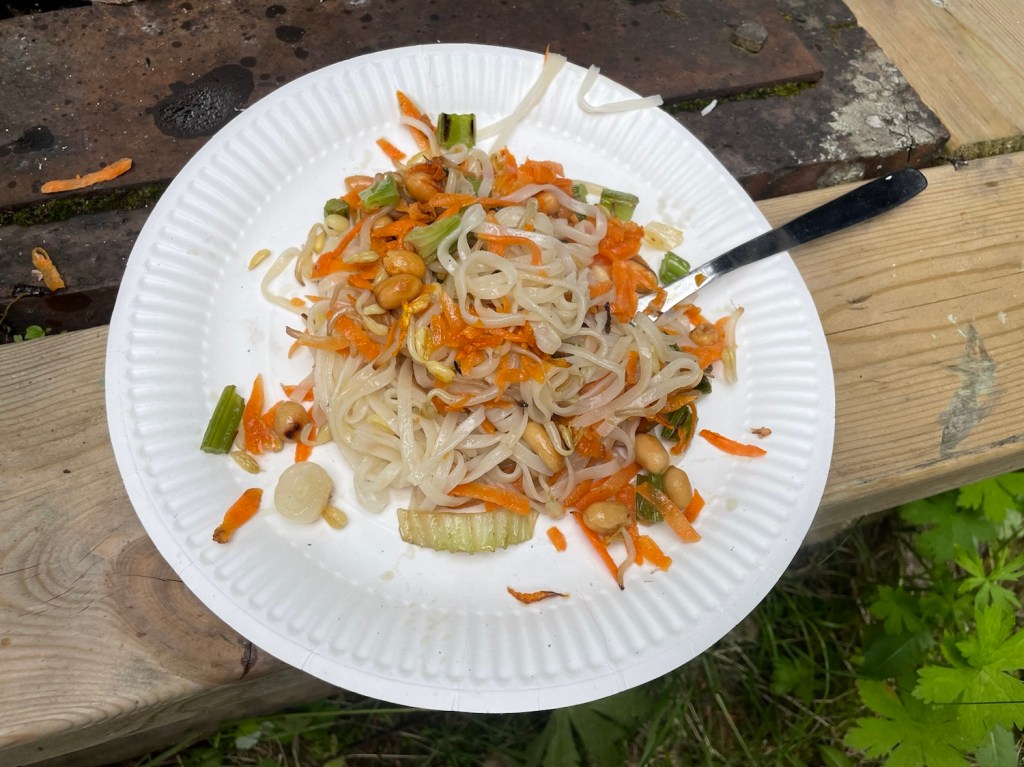 Rätten blev en god vegansk wok med rivna morötter i tillägg. Cecilia grillade falukorv som hon hade till woken.