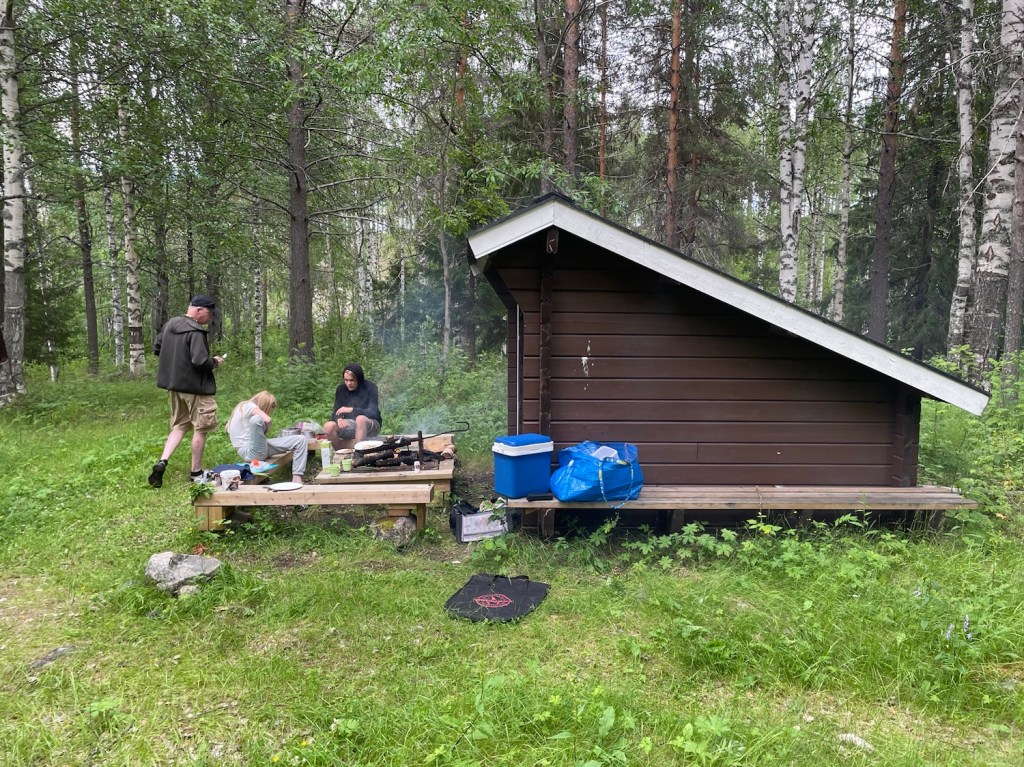 Den här gången för äta ute hade jag med mig Robert och hans barn Kalmer och Cecilia. Jag valde platsen jag hade sett ut på min långtur med MTB runt Råne Älvdal. Kör mot Gunnarsbyn och sen vidare mot Överstbyn på väg 760. Strax efter bron vid Korpforsen parkera till vänster vid parkeringen där det också finns grillplatser där jag lagade lunch i vintras. Gå över över vägen och följ stigen längs efter den brusande älven. Du kommer till en smal spång där det rann vatten under när jag cyklade senast. På andra sidan ligger vindskyddet med en grillplats. Platsen skulle passa bra att tälta på den släta gräsytan framför vindskyddet.