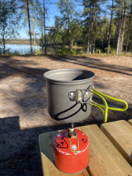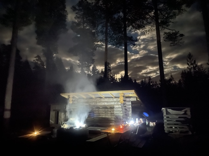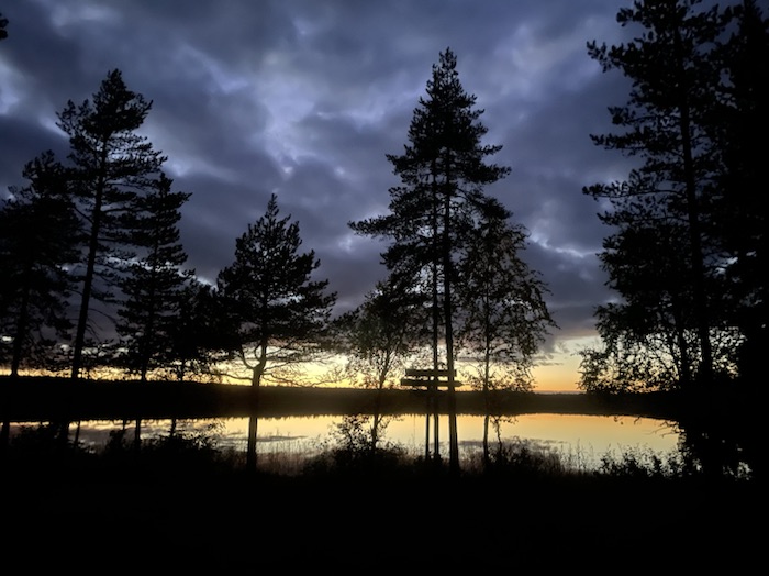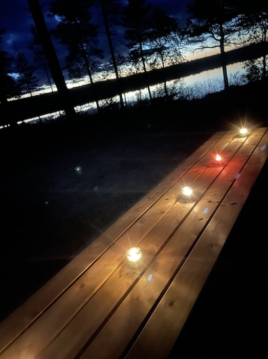 Jag kom iväg sent från Luleå på grund av att jag letade fotogenlyktor. Ett ställe var stängt och på två andra ställen fanns det inte. Hade en inre bild att jag hade med mig fotogenlyktor vid lägerplatsen. Tog istället med mig ljuslyktor och värmeljus. Körde mot Kalix och Google maps visade en väg genom renstängslet med det fanns en skylt förbjuden infart. Fick fortsätta en bit till på E4:an och svänga av norrut. Sen visade Google Maps att jag skulle svänga av till vänster på en liten skogsväg. Den var i dåligt skick och det låg en stor sten och blockerade framfarten så jag fick vända bilen och köra en stor runda via flera små byar för att komma till Kåtaträsket. En halvtimme senare var jag vid vindskyddet och det var ledigt. Tände de medhavda ljusen på bordet och brasan.