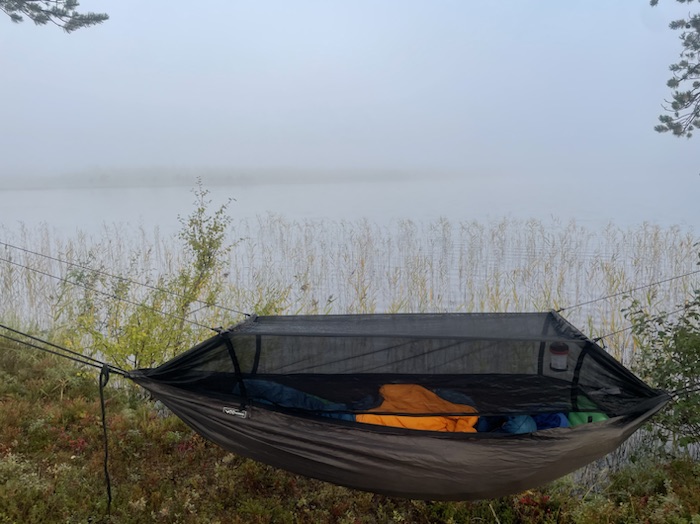 Nattens kondens föll ner från träden med ett knäppande ljud på marken. Den vita dimman låg tjock och började skingra sig. Bilarnas brus hördes då och då på avstånd från E4:an. Någon fisk slog nära mig på det spegelblanka Kåtaträsket. Svanarnas trumpetande ekade över sjön och försvann i fjärran. En hund skällde långt bort. Löven började gulna. Temperaturen gick ner mot 8 grader. Solen började tränga igenom dimman. En ko råmade en stund. Läste lite i boken Nomad.