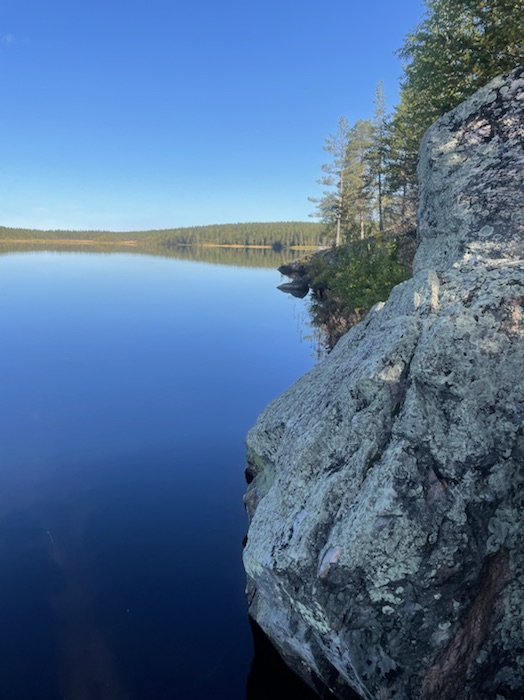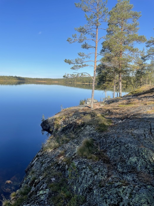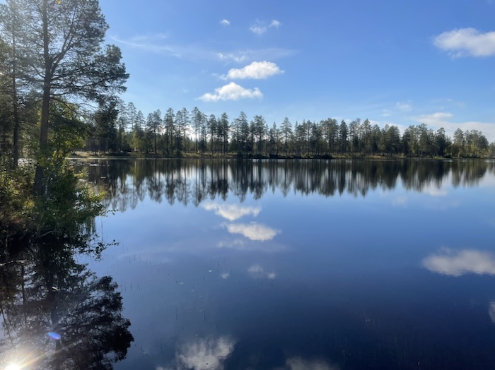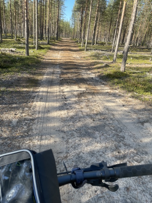 Började sen cykla efter Skridfinnarleden som gick efter stranden på det stilla Kåtaträsket.